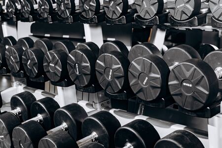 Stand with black steel dumbbells in the gym, fitness center. Concept of sports equipment and tools. Concept of sports and healthy lifestyle