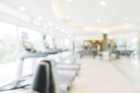 Abstract blur gym room interior with fitness equipment for background