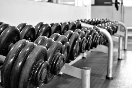 A close shot of gym weights on the shelf with blurred background in black and white