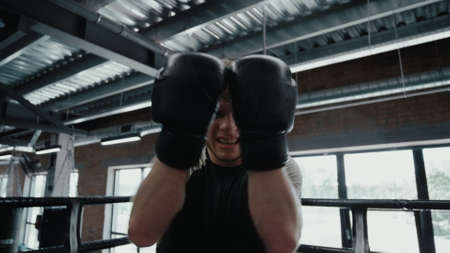 Closeup candid kickboxer training at gym. Portrait of focused sportsman boxing in sport club. Emotional fighter preparing to competition in fitness center.
