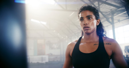 A female boxer training in the gym, portraying dedication and challenging traditional gender roles.