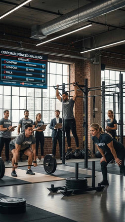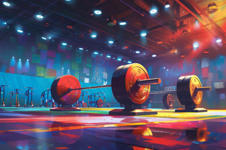 A dynamic view of a gym with barbell weights on the glossy floor, captured with vibrant lighting, evoking energy and readiness for an intense training session.