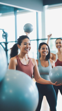 Exercising with fitness balls Three beautiful young women in sports clothing exercising with fitness balls and smiling : Generative AI