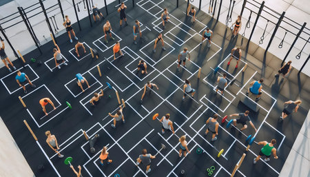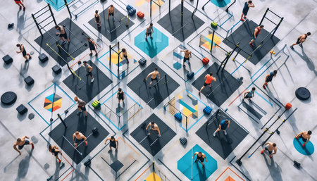 Drone-style top view of cross-training area with multiple anonymous athletes, Ai generated image