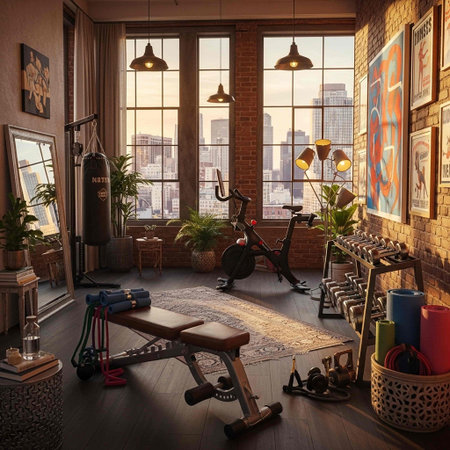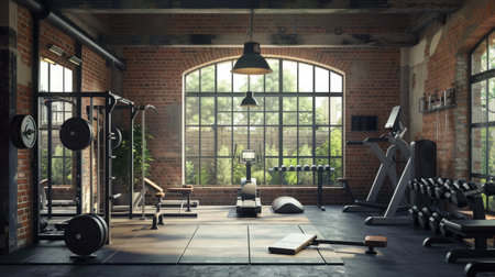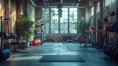 A modern, industrial-style gym with exposed brick walls, large windows, and workout equipment bathed in soft natural light.