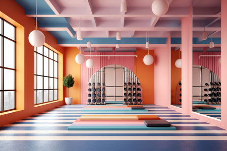 Interior of a fitness studio with pink walls, orange floor and a lot of yoga equipment. 3d rendering
