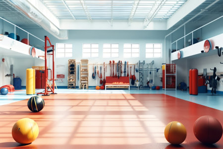 A large gym with hard wood floors and an array of exercise machines and equipment for a comprehensive workout, A school's gym filled with various sports equipment, AI Generated