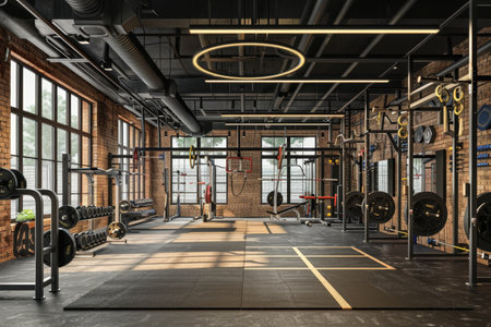 A modern gym filled with exercise equipment, large windows providing natural light, and motivational posters on the walls, creating an inviting and dynamic space for fitness enthusiasts.. AI Generation