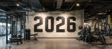 In a vibrant gym decorated for the holidays, large metallic numbers 2026 stand front and center. Fitness enthusiasts engage in intense workouts, embodying the New Year spirit