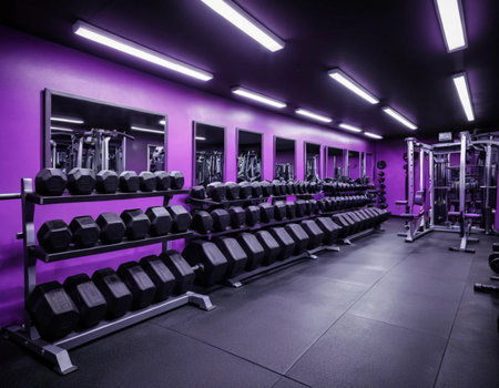 A modern gym interior featuring workout equipment with vibrant purple lighting. The space is designed for fitness enthusiasts seeking a stylish atmosphere for exercise.