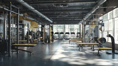 A modern gym filled with exercise equipment, large windows providing natural light, and motivational posters on the walls, creating an inviting and dynamic space for fitness enthusiasts.. AI Generation