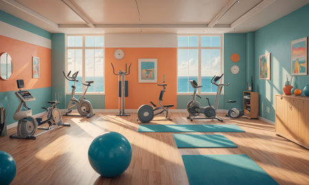 Radiant scene: Minimalist gym, students focused and aligned equipment., generative AI