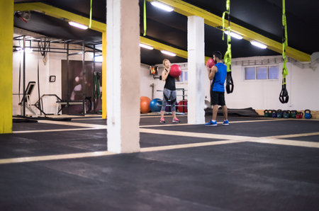 young athletes couple working out with medical ball at cross fitness gym