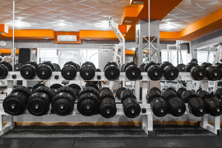Gym and dumbbell weight training equipment on sport