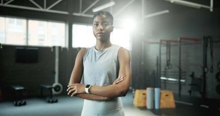 Fitness, portrait and black woman in gym with arms crossed, serious and confidence. Exercise, African person and ready for workout, training and wellness for physical improvement in health club