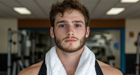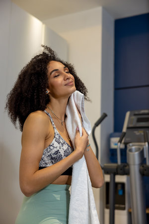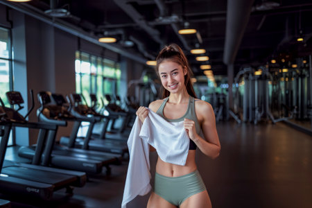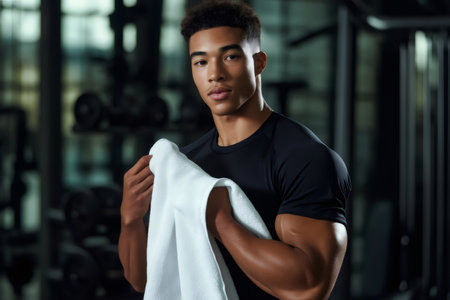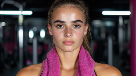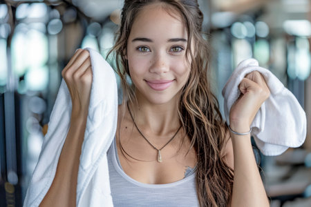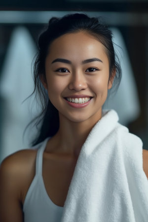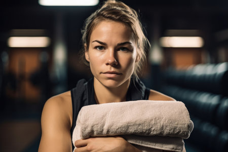 portrait of an athlete holding a towel in front of her, created with generative ai