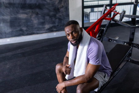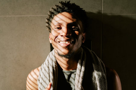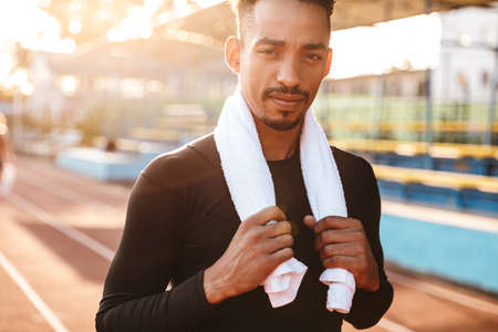 After Workout. Confident black sportsman with towel on shoulders looking at camera over black background, copyspace