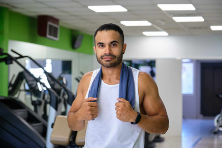 Portrait of a strong Hispanic man at a gym looking at camera.