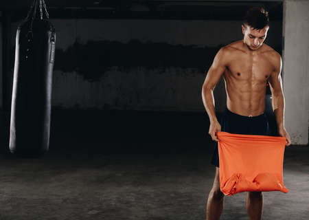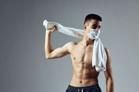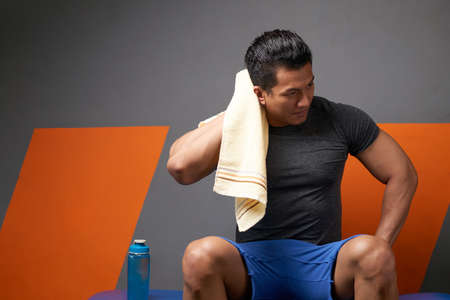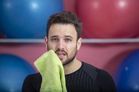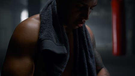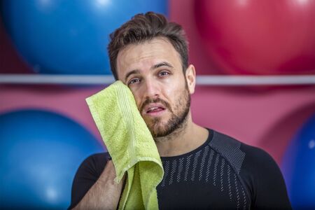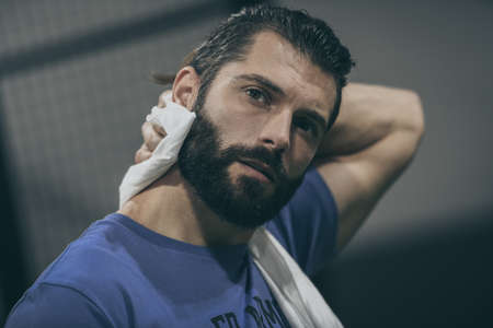 Portrait of a fit tired man wiping his face with a towel in the gym during training
