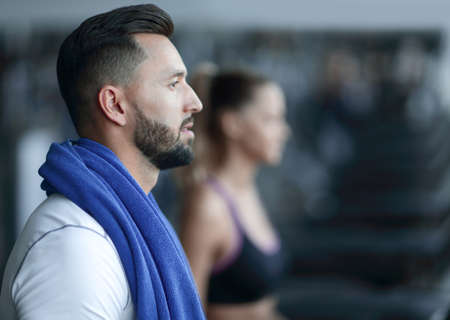 Sport man and woman with towel stand at the gym.fitness and lifestyle concept