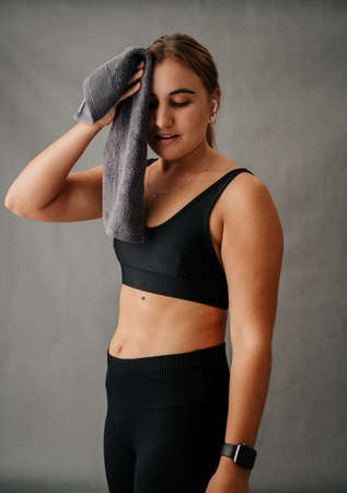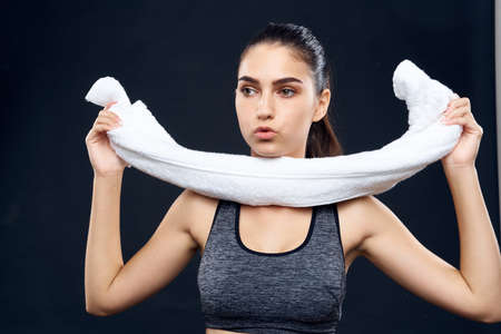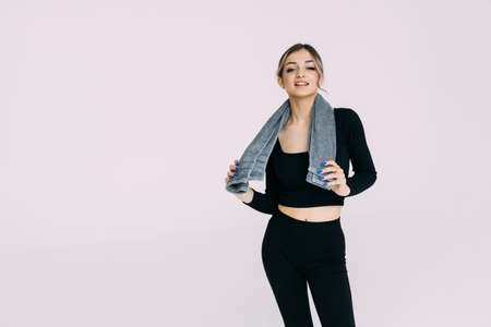 Pretty young fit sportswoman holding grey soft towel on her neck in isolation