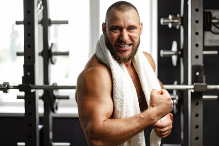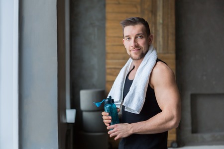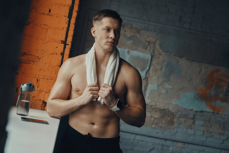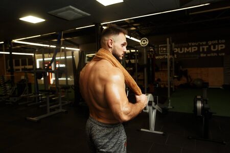 Attractive tall muscular bodybuilder holding the towel and resting after hard training in the gym.