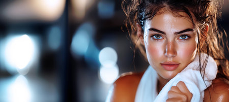 Beautiful Portrait of sexy young female in late 20s focused during gym workout white towel around neck wiping sweat. Soft, dramatic lighting highlights her face, muscles in moody atmosphere