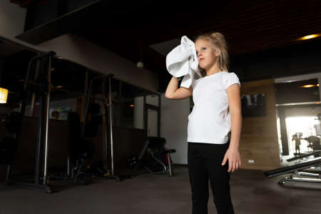 Little cute adorable caucasian blond girl doing finess exercise wiping head with towel in sport gym club indoors. Happy sporty tired child. Children healthcare workout and healthy lifestyle concept