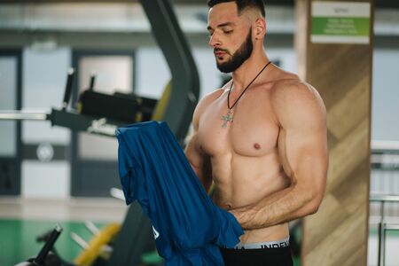 Shirtless muscular young male athlete in gym dressing room changing, with towel on shoulder