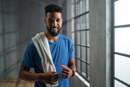 Happy young African American sportsman standing indoors at gym, looking at camera, workout training