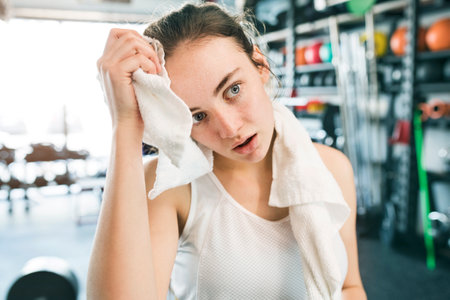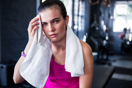 Young fitness girl with dental braces feeling exhausted after hard workout in gym, wiping her face with towel.