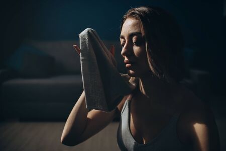 Portrait of a woman in sportswear with a towel after an intensive workout at home.Concept of health and fitness.