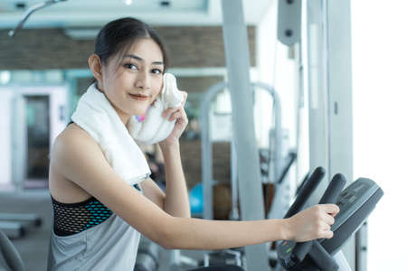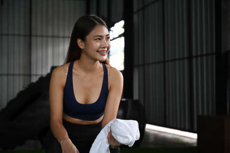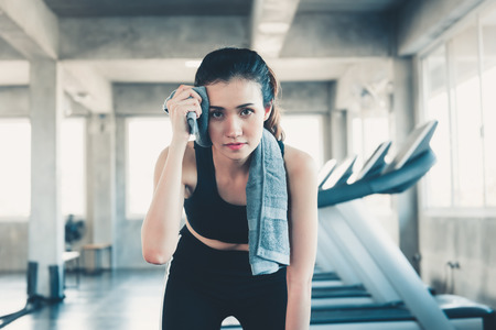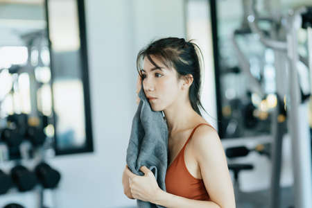 sport woman resting after workout and wipe the sweat by towel. sport and workout concept.