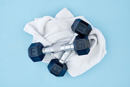 A banner with fitness training accessories, a towel and a hand-held rubber expander in the sunshine.