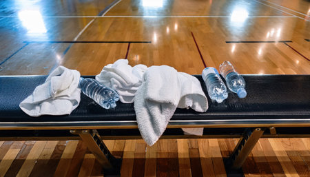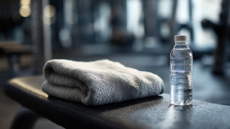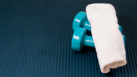 Black dumbbell, bottle of drinking water and white towel in gym or health club. sport, fitness lifestyle concept