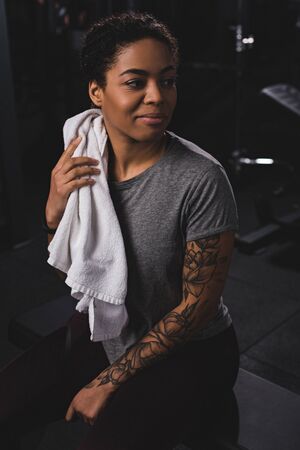 Woman having a break after working out at the gym, she is holding a towel behind her neck, fitness and sports concept
