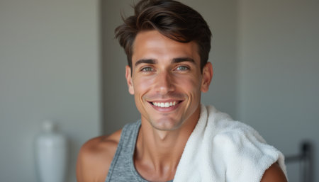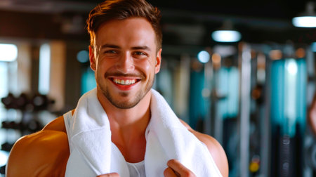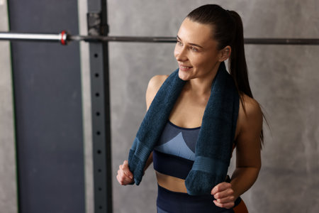 Close-up of a smiling woman holding a towel in a gym, with blurred fitness equipment in the background, emphasizing wellness and positivity.
