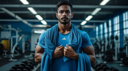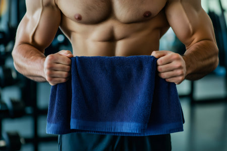 Bodybuilder showing his muscular torso holding a blue towel after an intense workout session in the gym