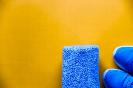 Flat lay sport shoes, bottle of water, towel on yellow background.