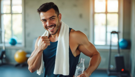 Confident young man carrying exercise mat and bottle with water while standing in gym : Generative AI