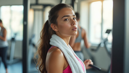 Smiling young woman in a gym holding a towel, surrounded by modern fitness equipment. Bright natural light highlights her athletic and confident appearance.