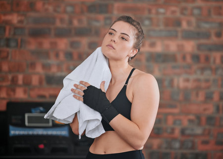 Healthy, fit and active female boxer wiping sweat with a towel after a workout in the gym or health club. Young woman completing and finishing training, exercising and working out in a fitness studio