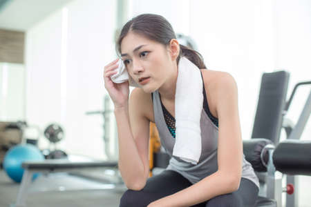 Attractive asian healthy woman in fitness gym taking a rest after work out. Sport exercise concept.
