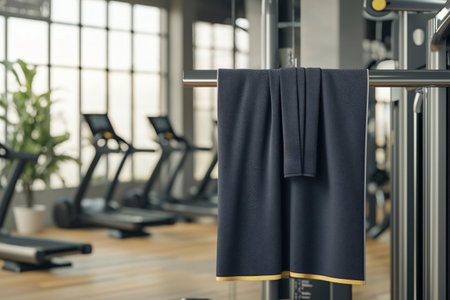 Customizable dark towel hanging in a fitness club with treadmills in the background, perfect for your branding project