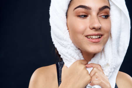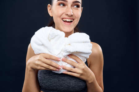 Smiling woman standing with towel around her neck over studio background and looking at camera