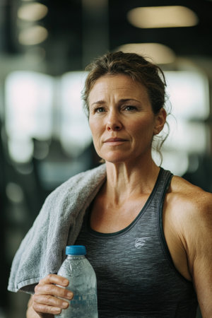 Middle-aged Caucasian female boxer, with a determined look in her eyes, taking a water break in a well-lit, modern gym. She is holding a towel over her shoulder, her face showing the strain and satisfaction of intense training.