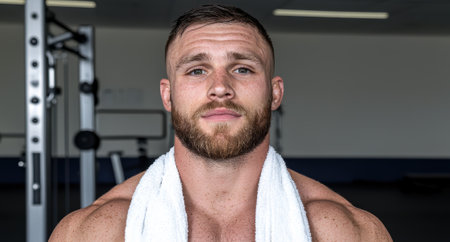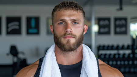 I finished my workout like a beast. Portrait of a muscular young man standing with a towel around his neck in a gym.