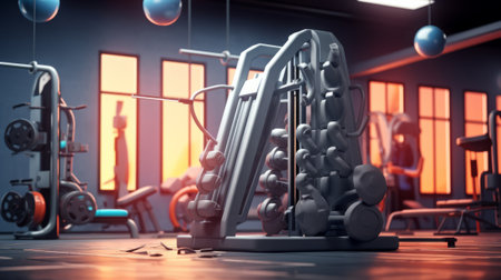 Modern gym equipment in an industrial setting with well-lit training area and focus on resistance machine details. Generative AI