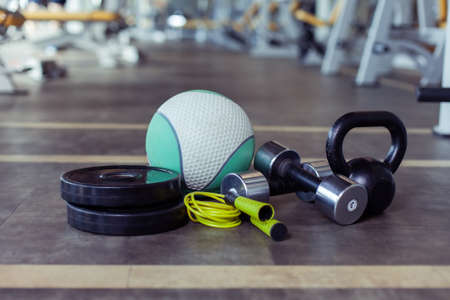 Fitness or bodybuilding concept background. Ball and dumbbell exercise weights on the floor
