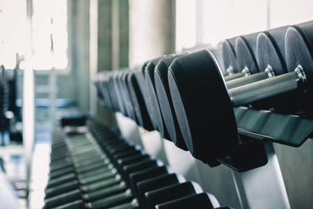 Close-up dumbbells on rack in modern fitness gym interior with sports training equipment. New sport center inventory for sports exercises workouts. Workout and training concept. Copy ad text space